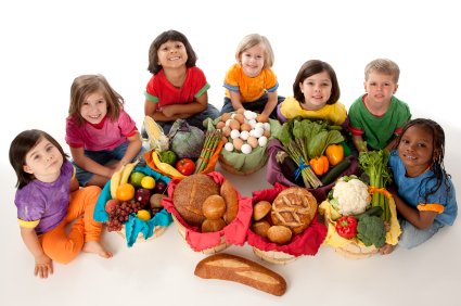 A high angle image of a diverse group of children holding baskets with the food groups of fruits vegetables dairy meat and grains