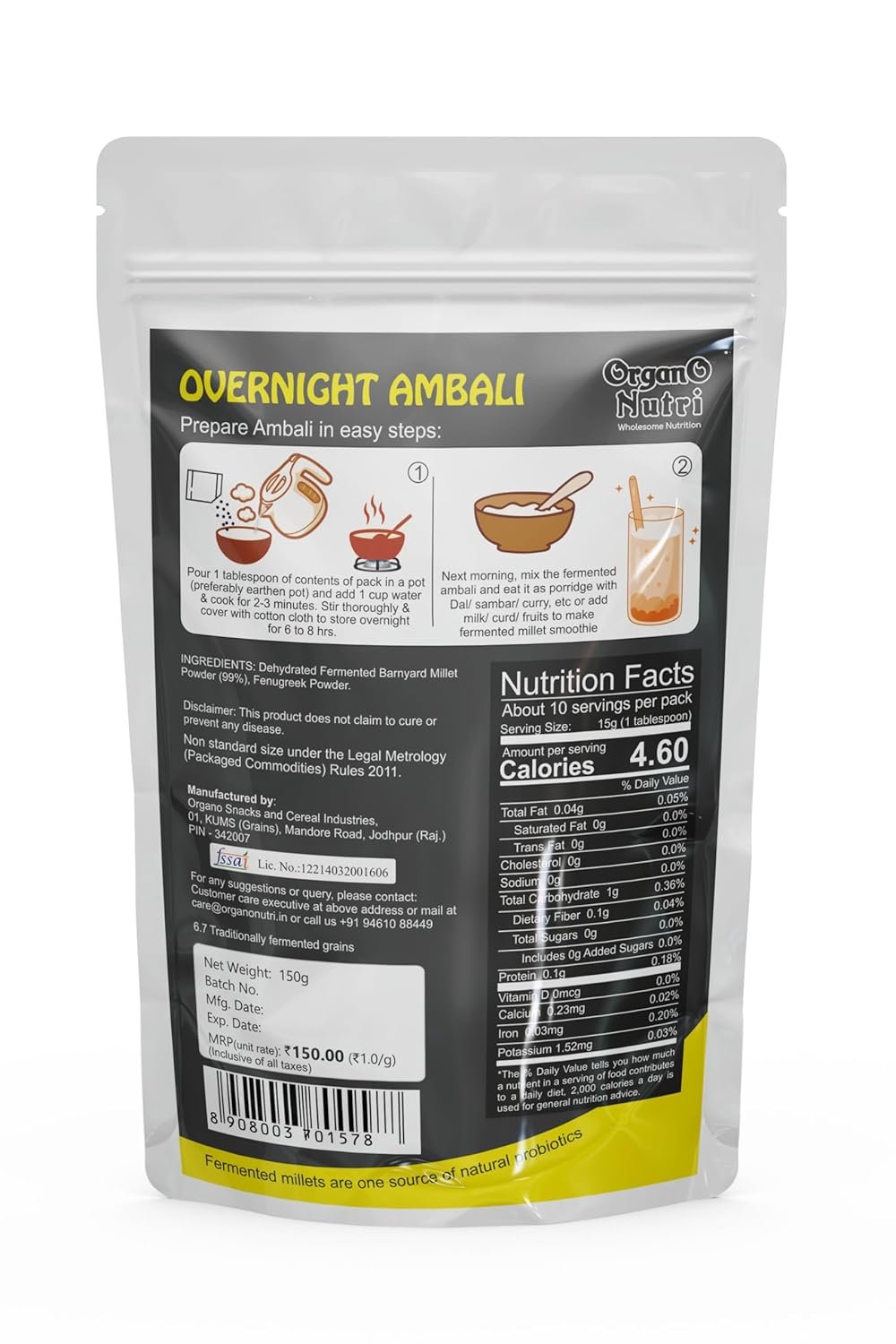 OrganoNutri 24Hr Fermented BANYARD MILLET Ambali Powder, 300g (2 Packs of 150g), Probiotic Overnight Ambali, Non-GMO, Gluten Free